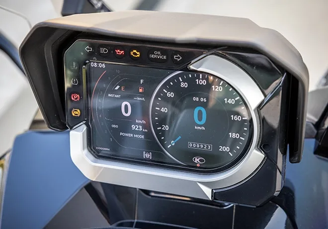 Le Kymco CV3 ne se contente pas d’un design audacieux et de performances solides ; il mise également sur un arsenal technologique complet et une dotation en équipements digne des scooters haut de gamme. Au cœur du poste de conduite, on trouve une instrumentation numérique TFT couleur de 6 pouces, offrant une lisibilité optimale en toutes circonstances. Cette interface moderne permet notamment d’accéder au système Noodoe, la plateforme connectée de Kymco. Grâce à cette technologie, le conducteur peut personnaliser l’affichage, recevoir des notifications, planifier des itinéraires avec guidage GPS et même coupler son smartphone pour suivre les appels et messages en toute sécurité. Côté confort, le CV3 joue la carte du haut de gamme avec une bulle réglable électriquement, un démarrage sans clé (keyless), un frein de parking automatique pratique à l’arrêt, et un éclairage full LED, garantissant une visibilité optimale de jour comme de nuit. La selle double confort avec dosseret pour le pilote et le grand espace de rangement sous la selle complètent l’offre, rendant le CV3 parfaitement adapté à un usage quotidien comme aux longues distances. Enfin, pour les trajets en toutes saisons, le scooter est équipé de poignées chauffantes de série, un plus notable pour les utilisateurs réguliers. Avec cet ensemble technologique et ergonomique, le Kymco CV3 affirme sa place de référence premium sur le segment des scooters trois-roues, alliant sécurité, connectivité et praticité.