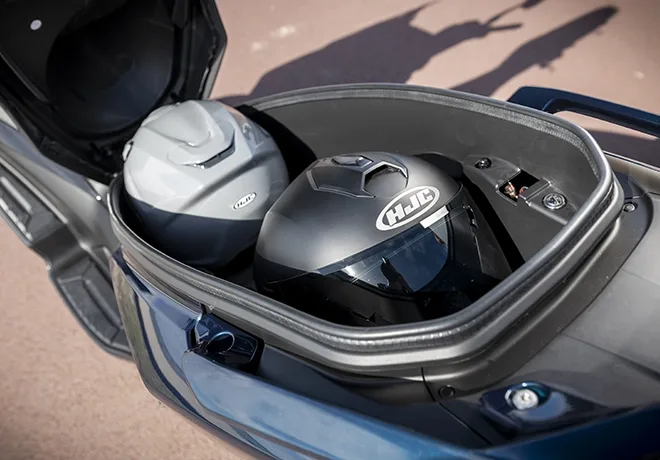 Le coffre sous la selle peut contenir un casque intégral et un casque jet, un véritable avantage pour un 125 cm³. Une prise USB est également intégrée dans le vide-poche avant, de quoi recharger un smartphone ou alimenter un GPS en déplacement.
