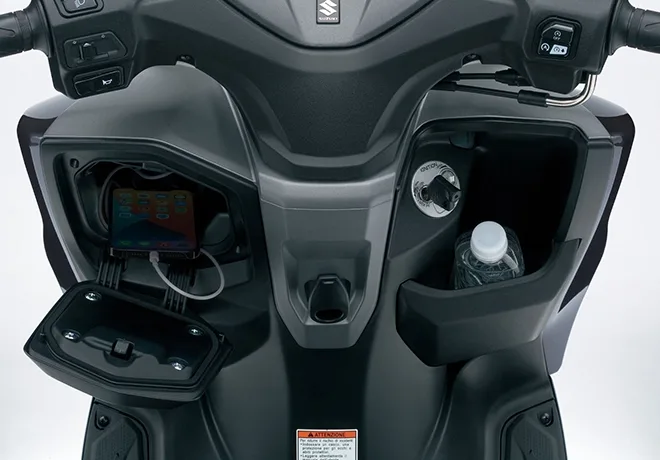 Le Burgman Street 125 EX embarque une instrumentation numérique claire et complète qui affiche les données essentielles telles que la vitesse, la consommation, l’autonomie, l’horloge ou encore les rappels d’entretien. Le tout est facilement lisible, même en plein jour. Une prise USB est astucieusement intégrée au vide-poche avant, permettant de recharger un smartphone ou un GPS pendant le trajet.